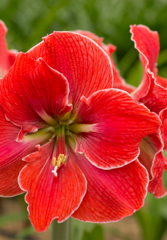 Colour: Vibrant red petals with white edges and delicate white veining. The center features a light green throat.