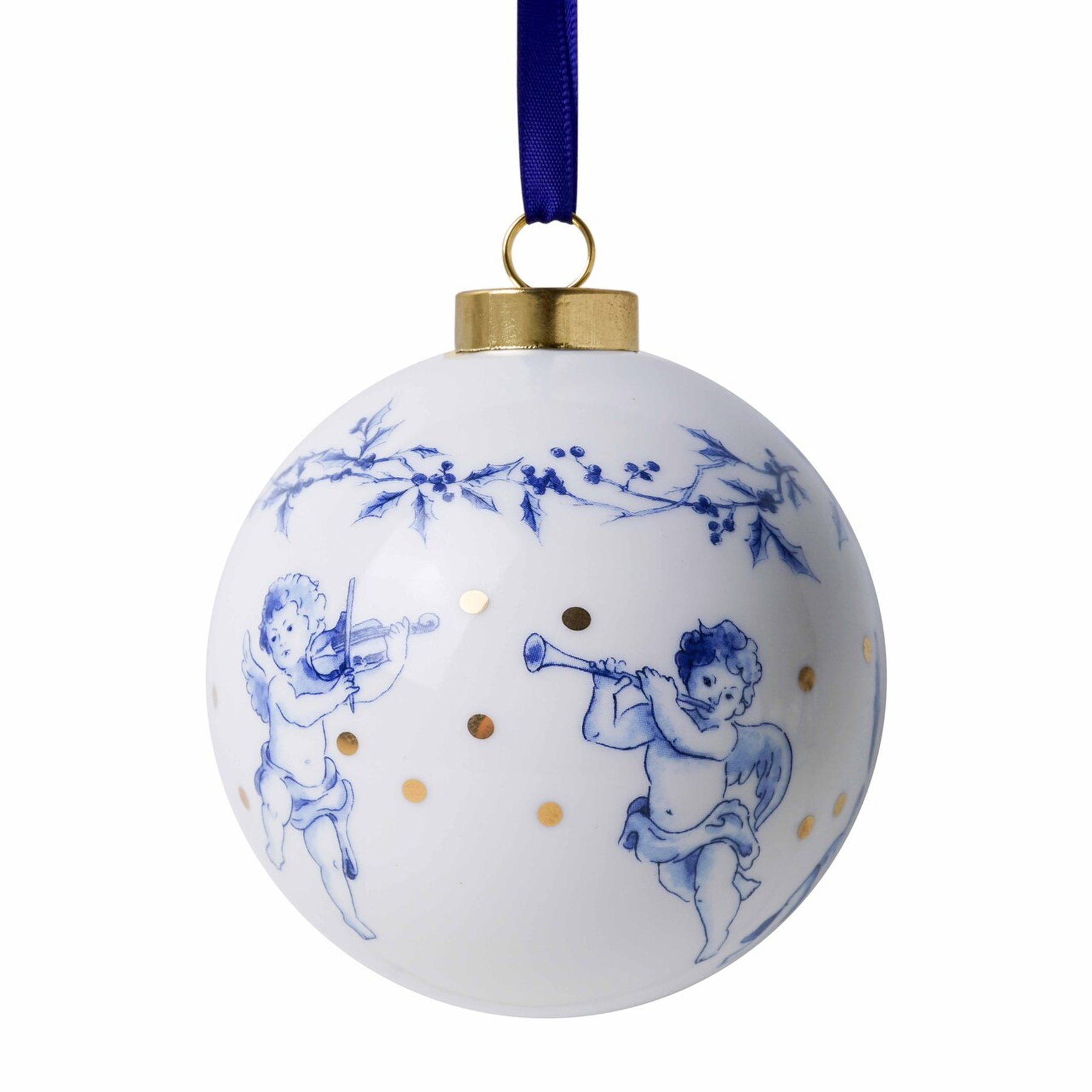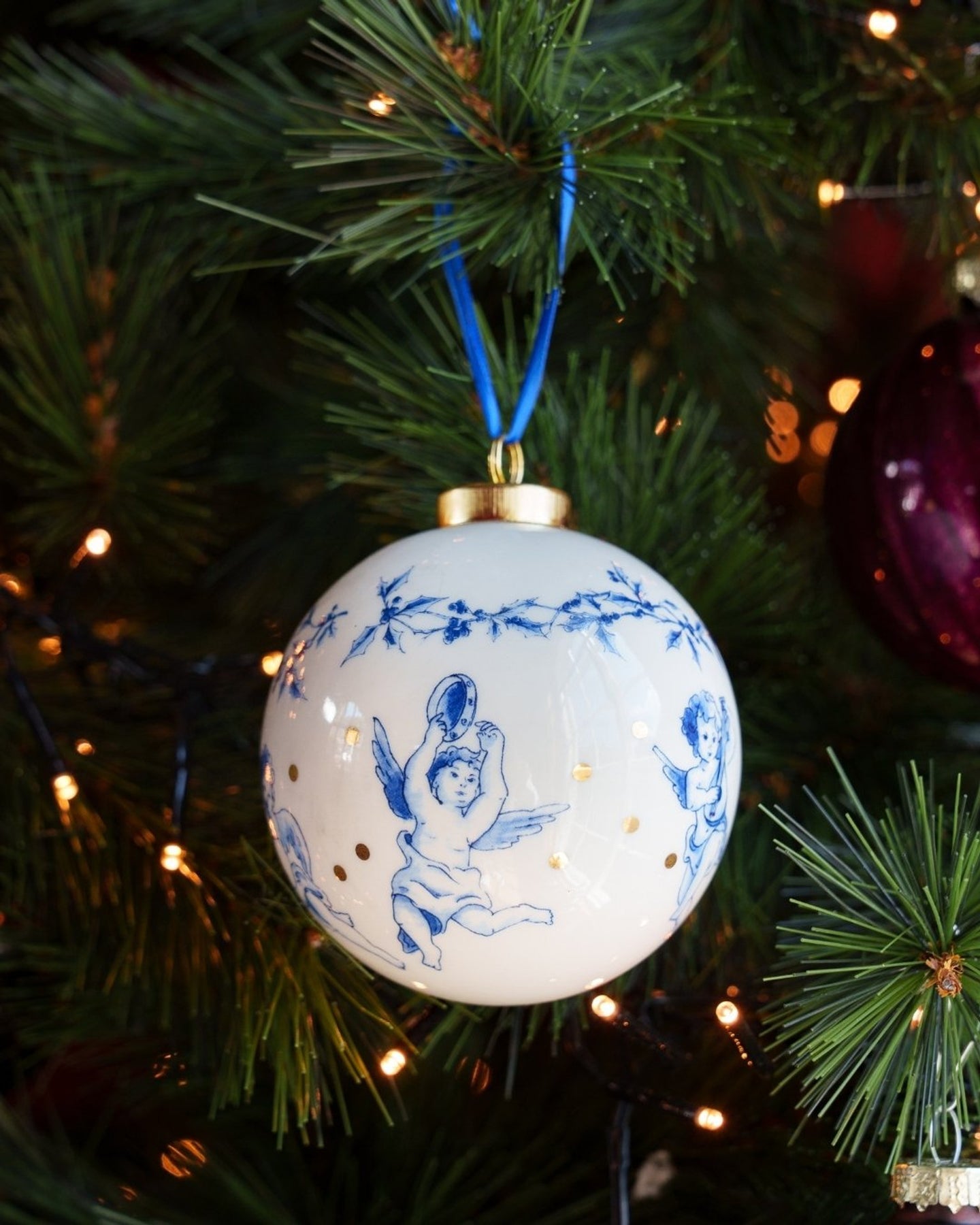 • Round Christmas bauble decorated all around with Delft blue angels and musical motifs, surrounded by golden confetti and holly branches