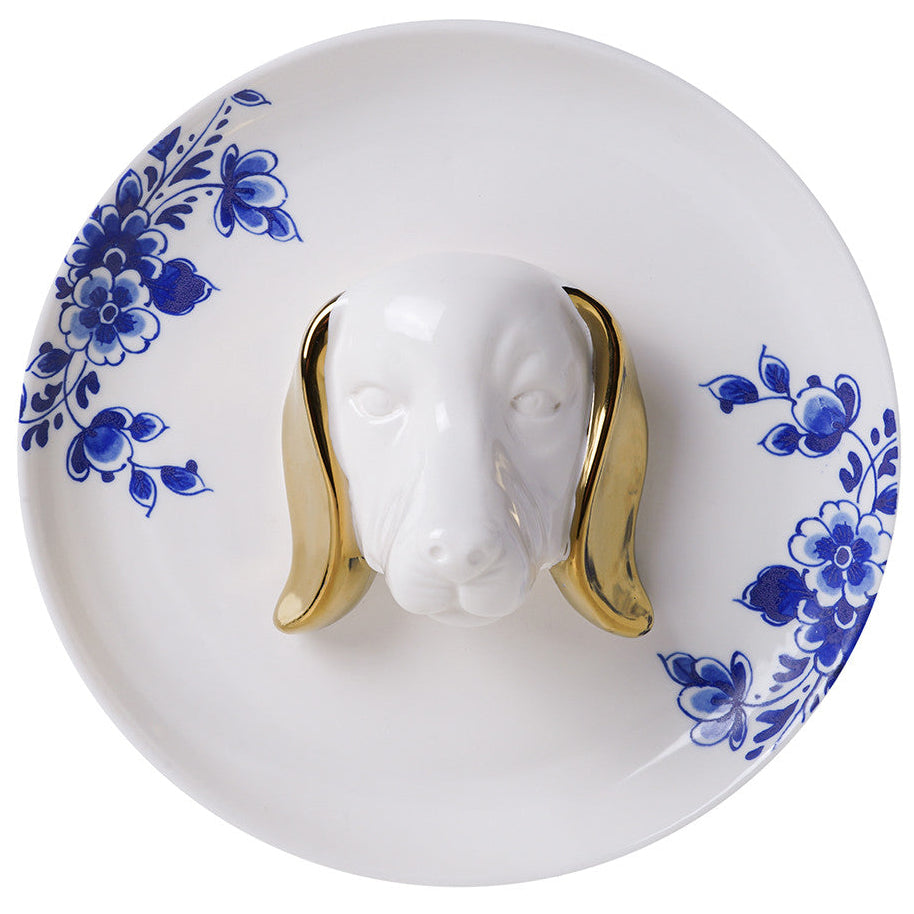 • Three-dimensional decorative wall plate featuring a dog head in relief