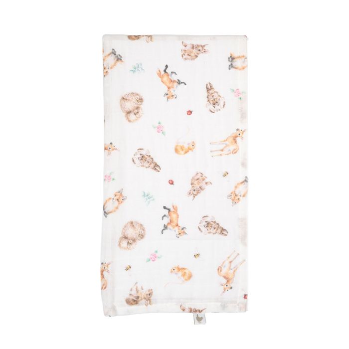 • Featuring the “Little Forest” woodland animal design: one cloth with a placement print on a light pink background, the other with an all-over pattern on a white background with woodland animals in the corners